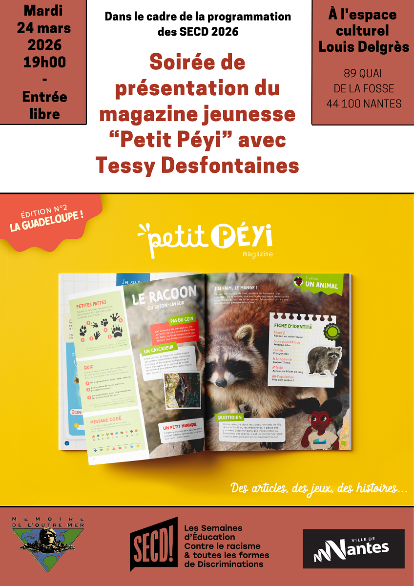 Dans le cadre de la programmation des SECD (Semaines d’Éducation Contre le racisme et toutes formes de Discriminations), Mémoire de l’Outre-Mer vous convie à la soirée de présentation du magazine jeunesse « Petit Péyi », avec Tessy Desfontaines.